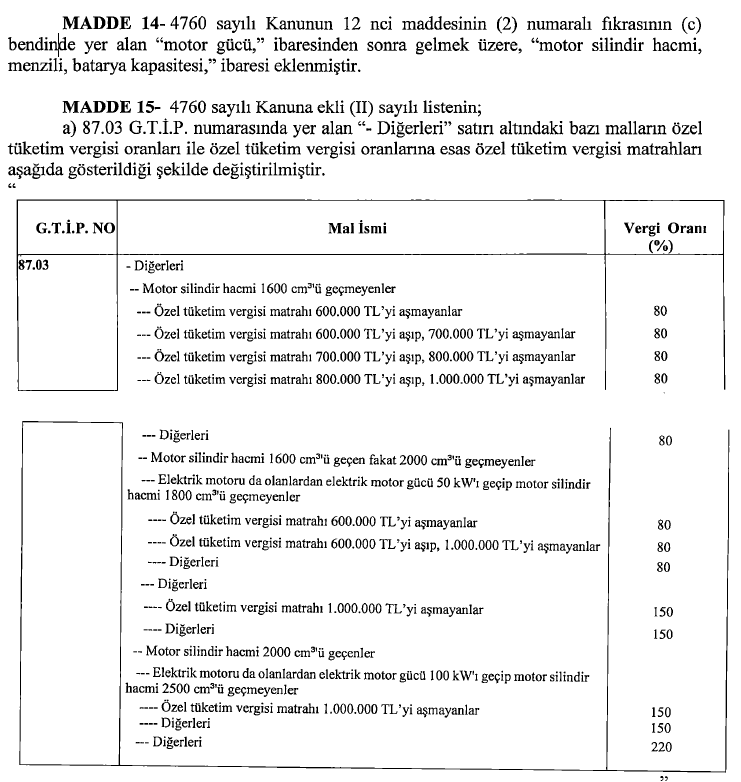 Aynı halde 1600 cc ile 2000 cc ortasındaki motor hacmine sahip araçlar da yeni düzenlemede %80 vergi dilimine dahil ediliyor. Daha üst hacimli araçlarda ise ÖTV oranı %150 ve %220 üzere yüksek düzeylerde kalmaya devam ediyor.