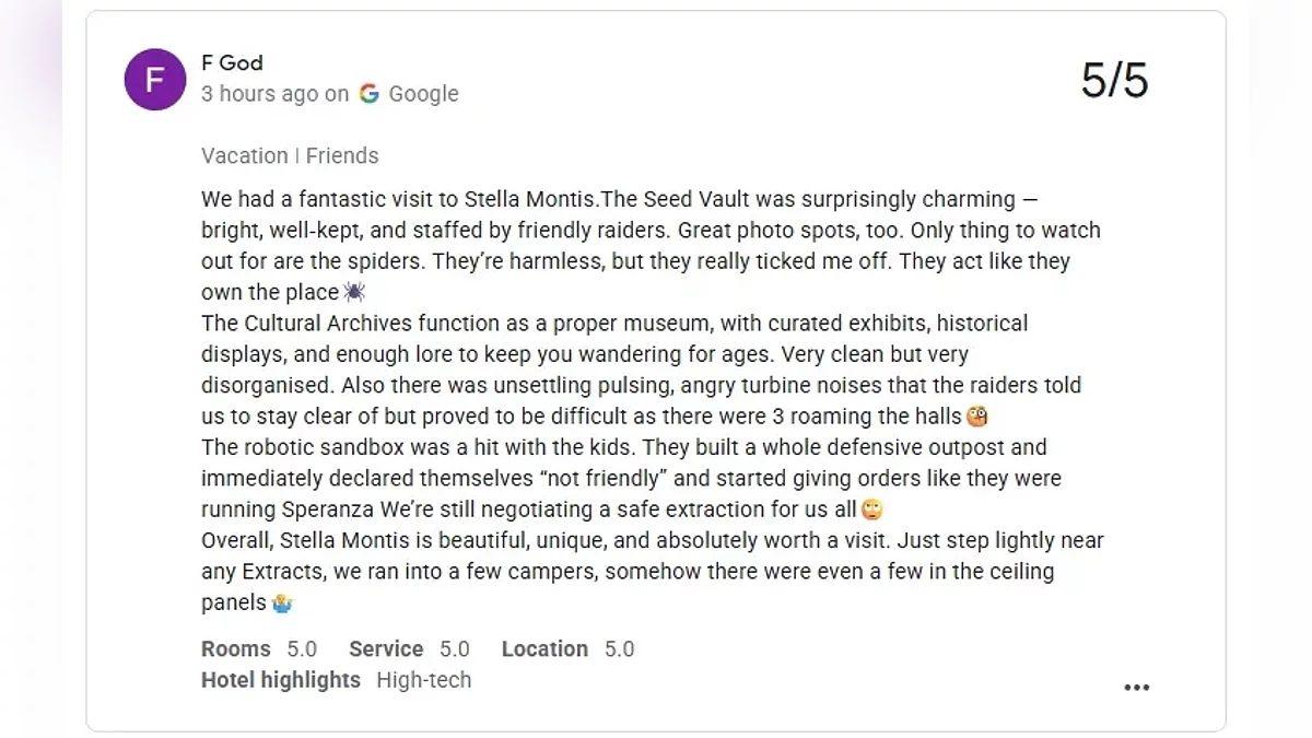 Bir öbür “titiz” raider ise Google’ın ayrıntı alanlarını bile doldurmuş. Otel öne çıkan özelliği olarak oyundaki üzere “high-tech” işaretlenmiş, yürünebilirlik “biraz labirent üzere lakin cümbüşü orada” diye tanım edilmiş, yiyecek-içecek kısmına da “bol bol bandaj alın” notu düşülmüş.