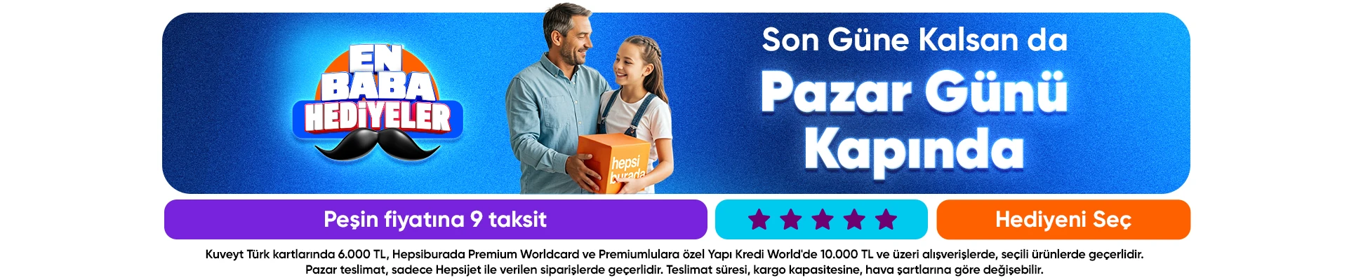 Hepsiburada’nın Babalar Günü kampanyası bu kategorilerde cazip fırsatlar sunuyor. Ayakkabılarda yüzde 60, spor ayakkabılarda yüzde 50, saat ve aksesuarlarda yüzde 45 indirimlerin yanı sıra taksit imkanları da bulunuyor. Teknoloji eserlerinde kupon avantajları, mutfak eserlerinde iki al bir öde seçenekleri ve tıraş makinelerinde peşin fiyatına taksit imkanları kampanyanın öne çıkan avantajları ortasında.