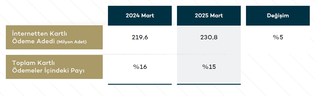 İnternet üzerinden yapılan kartlı ödemelerde de büyüme devam etti. 2024 yılı Mart ayında 354,7 milyar TL olan internetten kartlı ödeme fiyatı, bu yılın tıpkı devrinde yüzde 46 artarak 518,5 milyar TL’ye yükseldi. Lakin toplam kartlı ödemeler içindeki hissesi yüzde 30’dan yüzde 29’a geriledi. İnternetten yapılan süreç adedi ise yüzde 5 artarak 230,8 milyon adede çıktı.