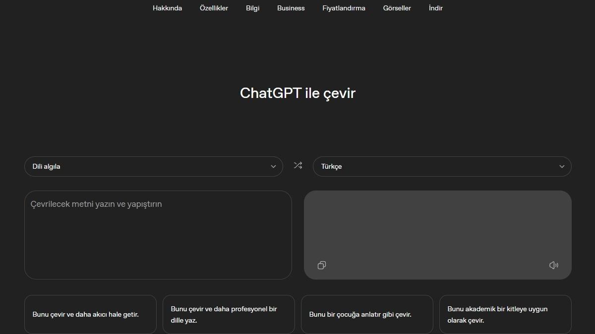 ChatGPT Translate’i buradan kullanmaya başlayabilirsiniz. Kullanmak için ChatGPT üyeliğine gereksiniminiz bulunmuyor.