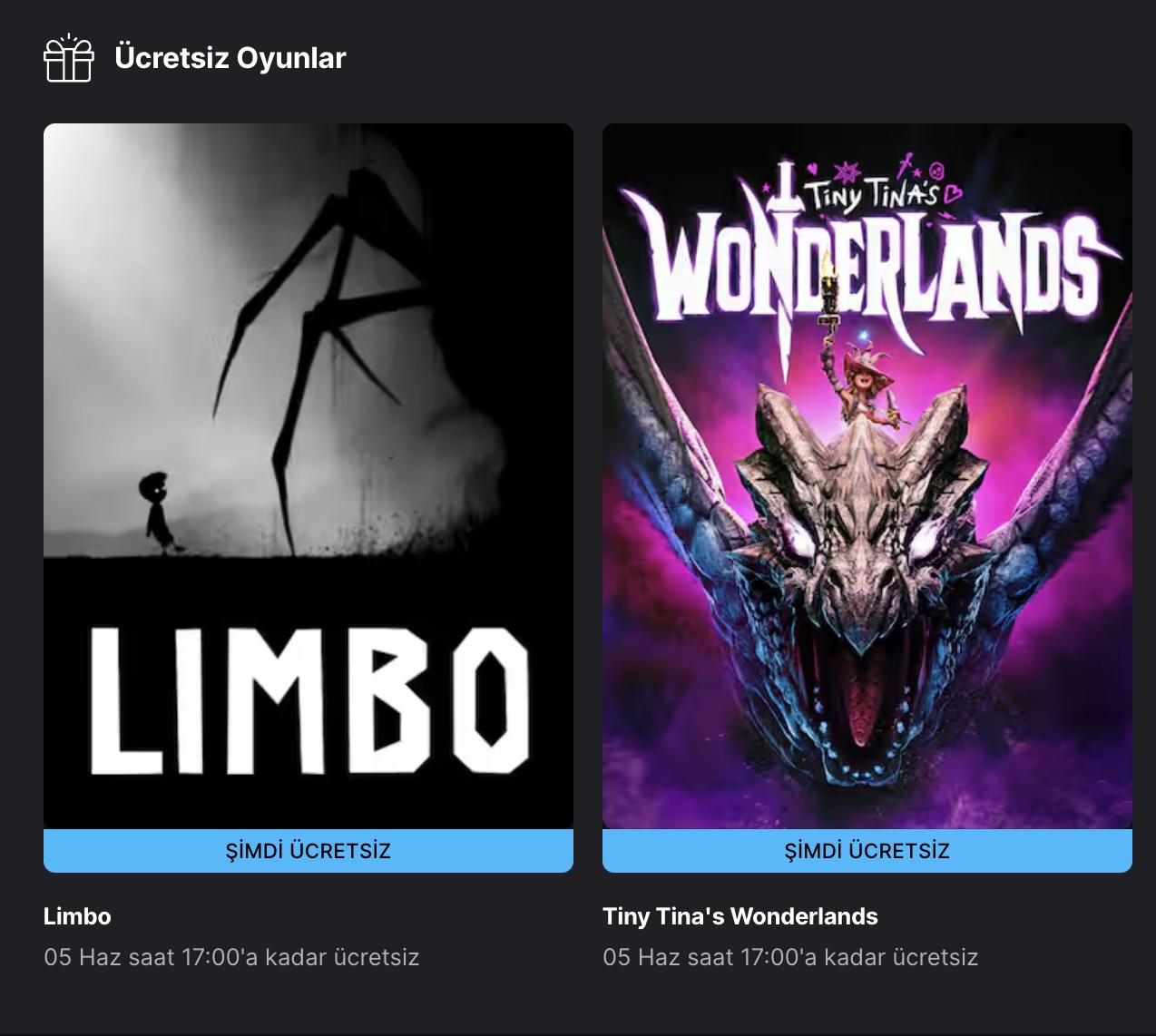 Geçtiğimiz hafta Deliver At All Costs, Gigapocalypse ve Sifu’yu fiyatsız bir formda erişime açan Epic Games Store, bu hafta Limbo ve Tiny Tina’s Wonderlands’ı fiyatsız yaptı. İki oyun da 5 Haziran’a kadar fiyatsız olacak. Bu tarihe kadar kütüphanenize eklerseniz kalıcı olarak sizin olacağını belirtelim.