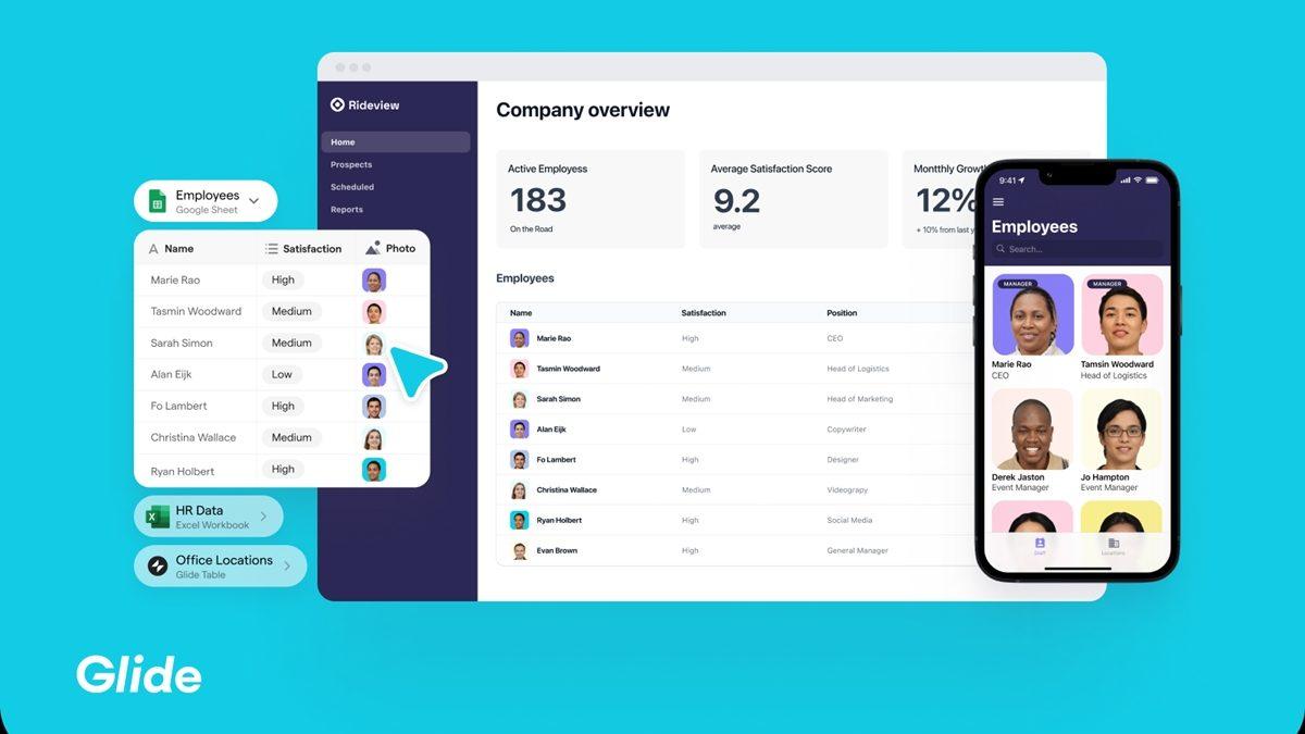 Uygulama geliştirme sürecini en kolaya indirgeyen araçlardan biri olan Glide, elinizdeki bilgileri saniyeler içinde fonksiyonel bir uygulamaya dönüştürme yeteneğiyle öne çıkıyor. Çoklukla bir Google E-tablosu, Excel belgesi yahut Airtable veritabanını kaynak olarak kullanan Glide, bu dataları okuyarak otomatik olarak bir taşınabilir uygulama arayüzü oluşturuyor.