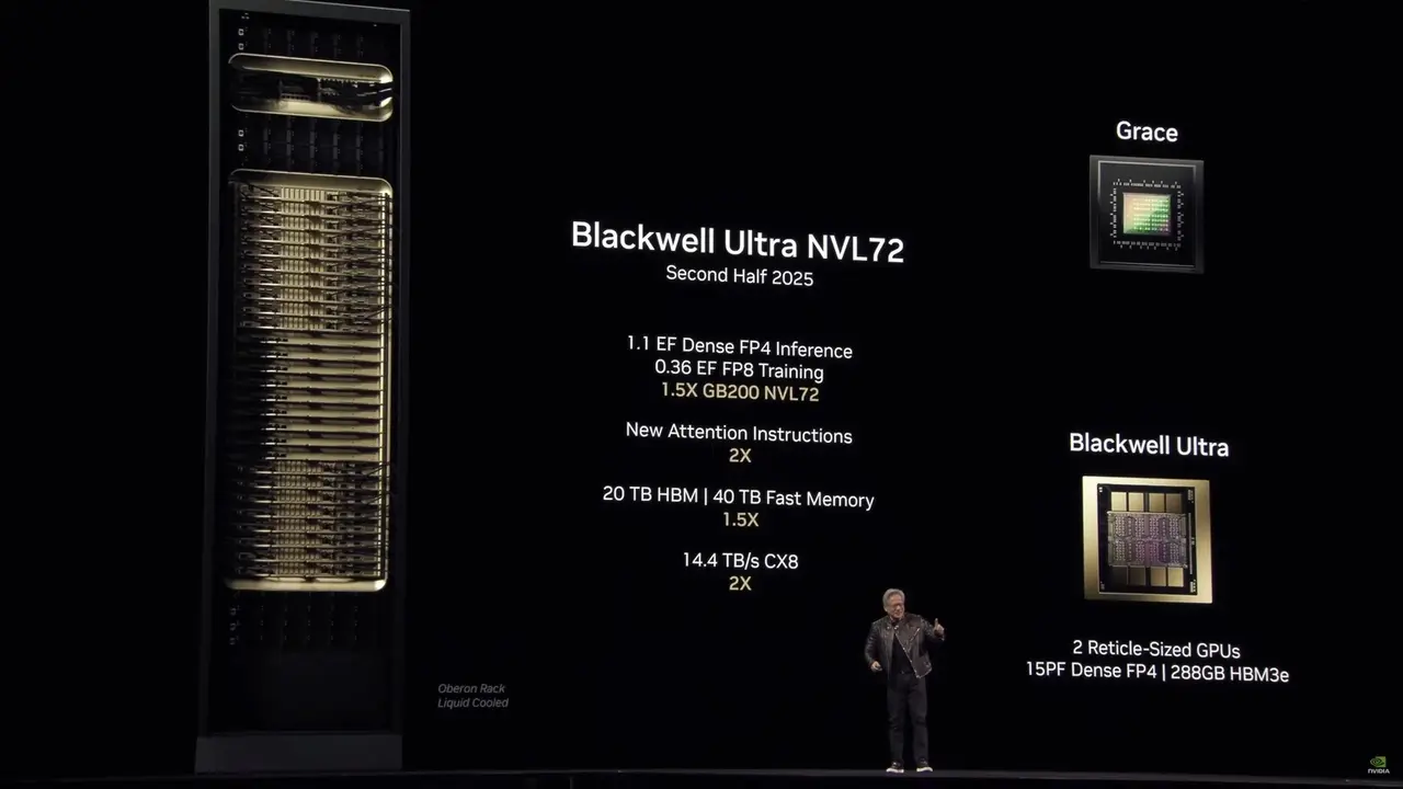 Blackwell Ultra GB300, 2025’in ikinci yarısında piyasaya sürülecek ve 20 petaflops yapay zeka performansı sunacak. Eser Blackwell serisinin mevcut modellerine misal bir kapasiteye sahip olmasına karşın, 288 GB HBM3e bellek ile daha gelişmiş bir performans sunuyor. Nvidia, bu çipin H100 GPU’nun 1,5 dakikada tamamladığı bir süreci 10 saniyede gerçekleştirebildiğini açıkladı.