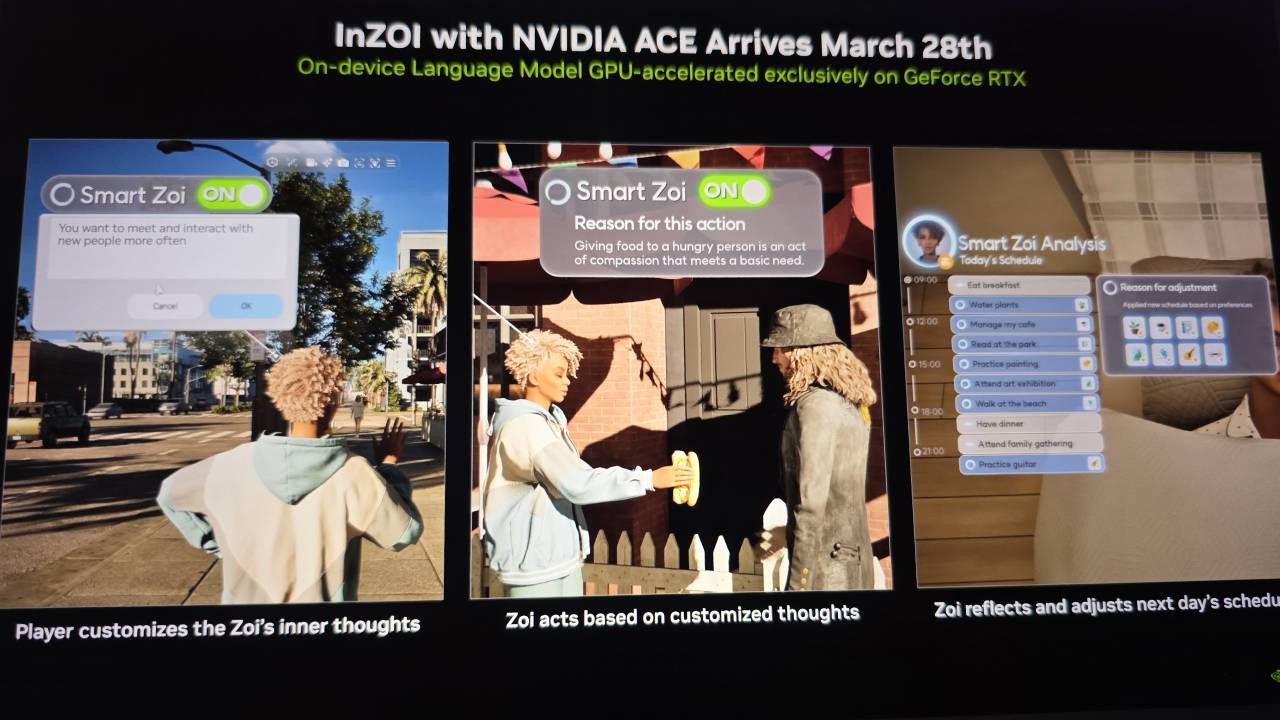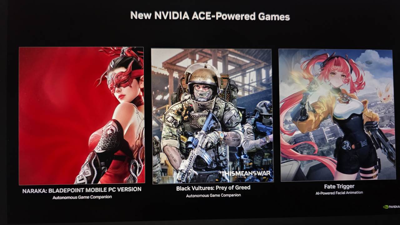 NVIDIA, ACE (Avatar Cloud Engine) teknolojisi ile yapay zeka takviyeli oyun karakterlerini de tanıttı. ACE dayanaklı oyunlar, NPC’lerin kendi kanılarını ve davranışlarını oluşturmasını sağlıyor. Bu teknoloji, oyun dünyalarındaki karakterlerin daha dinamik ve akıllı olmasına imkan tanıyor.
