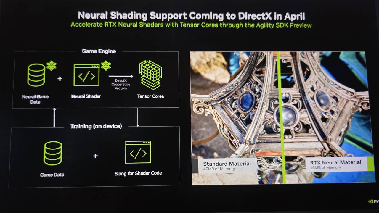 Gelelim aktiflikte anlatılan bir başka mevzuya: Neural Shading, NVIDIA’nın yapay zeka takviyeli yeni grafik teknolojileri ortasında yer alıyor. Bu teknoloji oyun motorlarının Tensor çekirdeklerine erişerek daha gerçekçi gölgeler ve materyaller oluşturmasını sağlıyor.