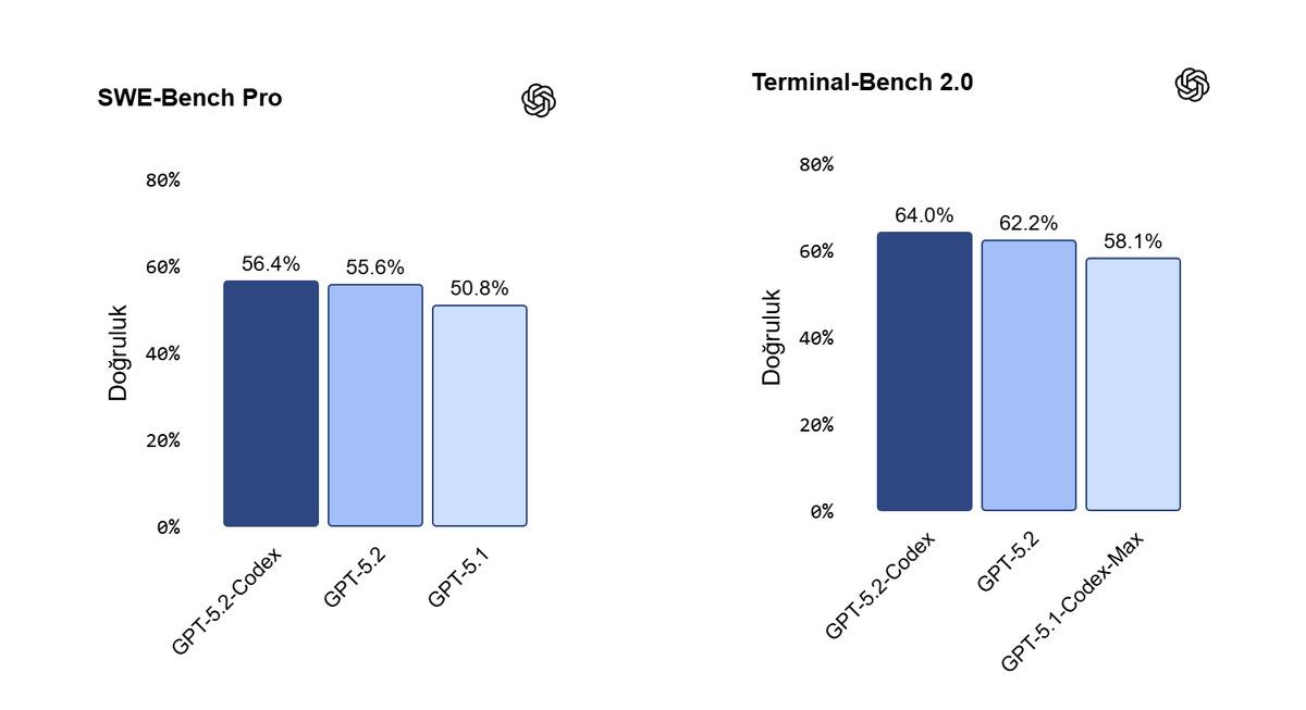 OpenAI’ın yayımladığı bilgilere nazaran yeni modelin SWE-Bench Pro testindeki muvaffakiyet oranı yüzde 56,4. Terminal-Bench 2.0 testinde elde edilen sonuç ise yüzde 64 düzeyinde.