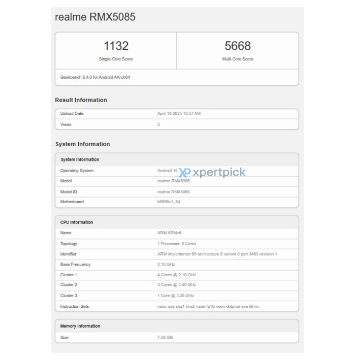 realme GT 7T, RMX5085 model numarasıyla Geekbench bilgi tabanında göründü. Akıllı telefon yapılan tek çekirdekli testlerden 1.132 ve çok çekirdekli testlerden ise 5 bin 668 puan almayı başardı. Böylelikle kimi özellikleri dolaylı yoldan da olsa muhakkak oldu.