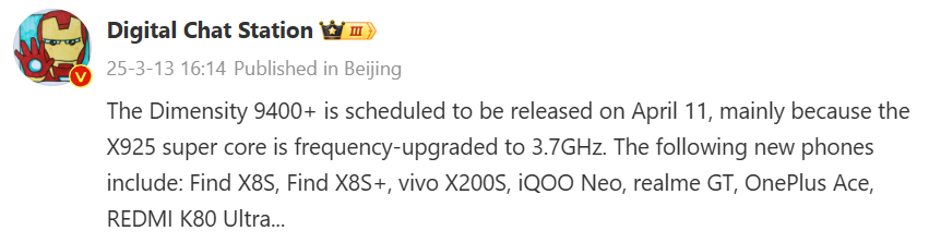 Bilindiği üzere Dimensity 9400‘da 1x 3.63 GHz ARM Cortex-X925, 3x 3.3 GHz ARM Cortex-X4 ve 4x 2.4 GHz ARM Cortex-A720 çekirdeklerin bulunuyor. Kaynak, yeni yonga setinin selefinin sürat aşırtmalı versiyonu olacağını ve Cortex-X925 çekirdeğinin 3,7 GHz suratlarında çalışacağını sav etti.