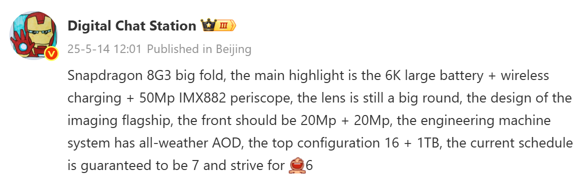 Katlanabilir telefon, Snapdragon 8 Gen 3 işlemcisinden güç alacak ve 6.000 mAh kapasiteli büyük bir bataryaya sahip olacak. Ayrıyeten, pilinin kablosuz şarjı destekleyeceği belirtiliyor. Art tarafta 50 MP çözünürlüğünde Sony IMX882 sensörüne sahip bir periskop telefoto lens bizleri karşılayacak.